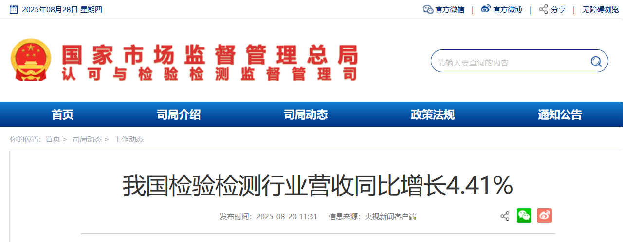 • 2025-08-28 我國檢驗檢測行業(yè)營收同比增長4.41%